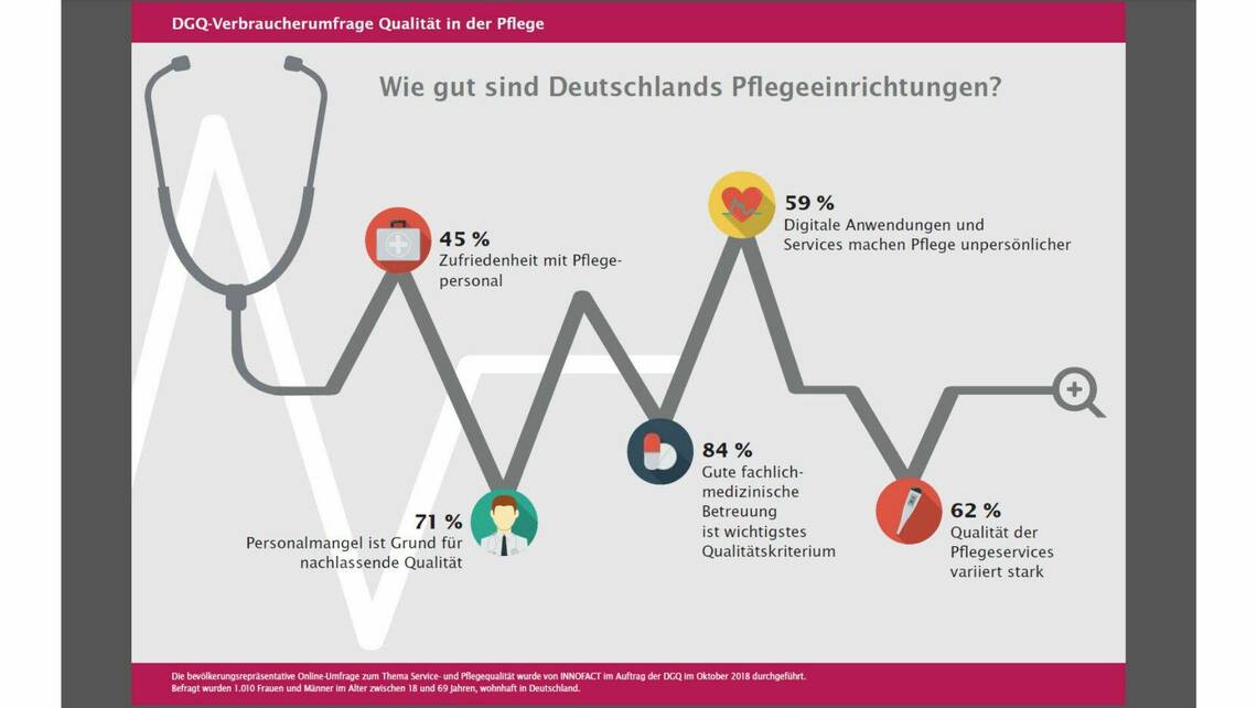 "Pflege heißt immer Dienstleistung für den Menschen. Die Umfrage zeigt, dass für Verbraucher gute Pflege mit dem Personal steht und fällt. Hier gilt es, für alle beteiligten Interessensgruppen aus Gesellschaft und Politik anzusetzen und kontinuierlich folgende Frage zu beantworten: Durch welche Maßnahmen und in welchen Bereichen muss das Pflegepersonal entlastet oder gestärkt werden, um eine hohe Pflegequalität zu gewährleisten?", kommentierte Claudia Welker, geschäftsführendes Vorstandsmitglied der DGQ.