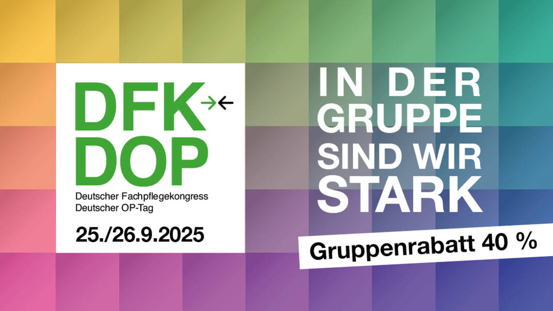 Weiterbildungsstätten aus den Bereichen OP-, Anästhesie-, Intensiv- und Notfallpflege sowie Gruppen ab 20 Personen können beim Deutschen Fachpflegekongress | OP-Tag (DFK) am 25. und 26. September 2025 sparen: Ab 20 Personen gibt es 40 Prozent Rabatt auf die Teilnahme am DFK in Münster.