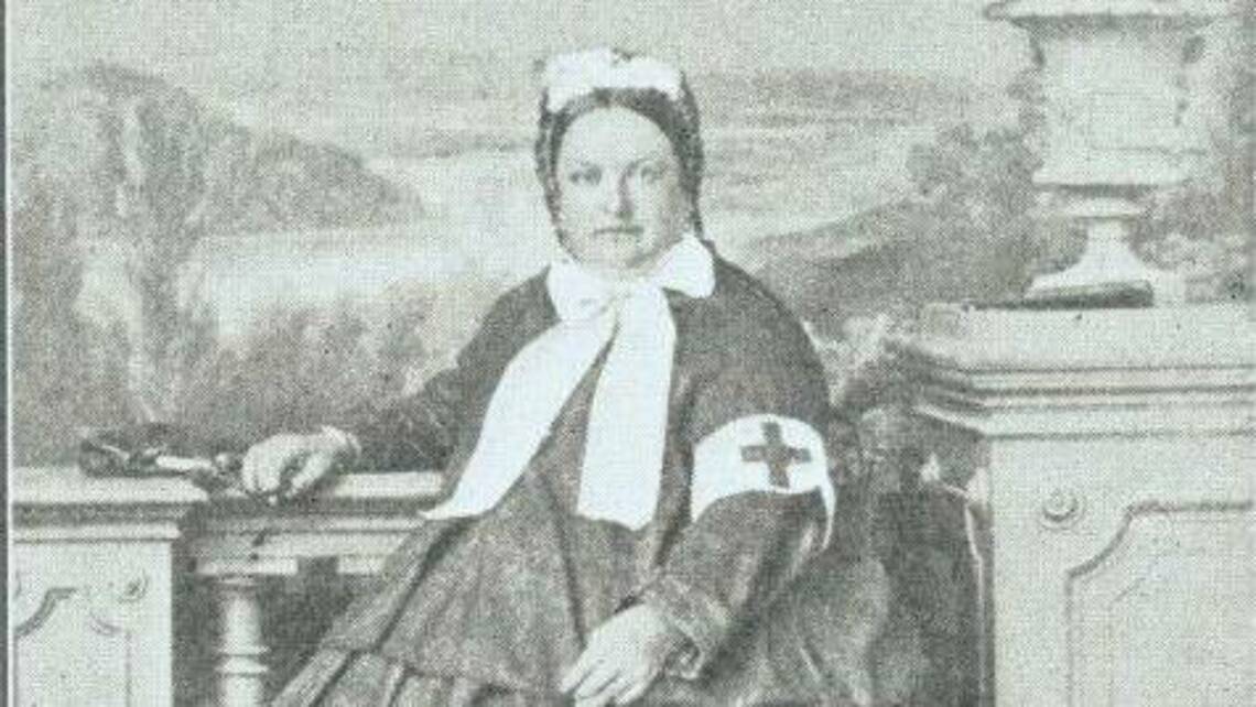 Erste Krankenpflegerin, die mit Rot-Kreuz-Armbinde Kriegsverletzte versorgte