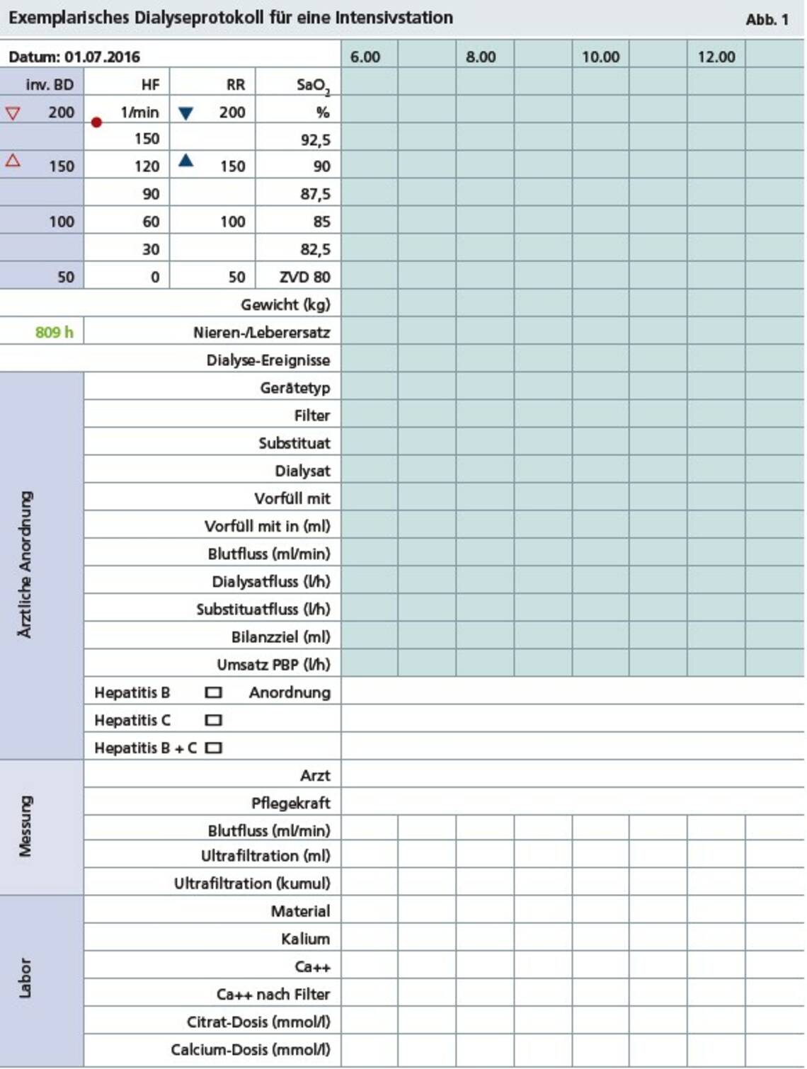Um eine sorgfältige Überwachung zu gewährleisten und Zuständigkeiten der Mitarbeiter präzise nachzuweisen, sind Dialyseprotokolle für Intensivstationen hilfreich (Abb. 1). Besonders wichtig ist hier zu erkennen, welcher Mitarbeiter für die Überwachung des Geräts zuständig ist. In der Dokumentation werden zudem die zu entziehende Menge an Flüssigkeit und die Drücke im Schlauchsystem festgehalten.