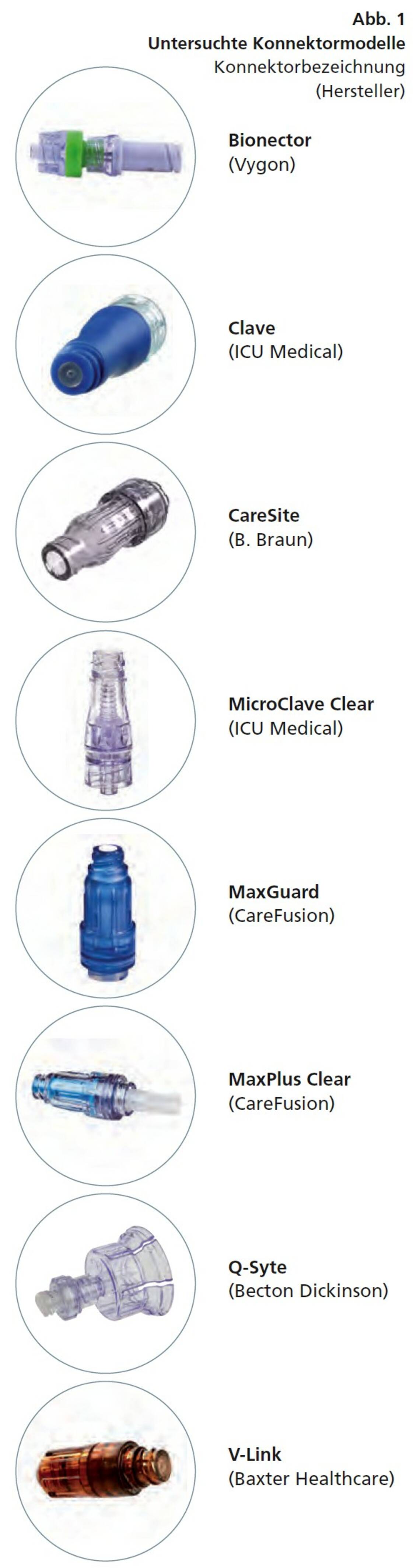 Ob diese Einwirkzeit ausreicht und ob alle kommerziell erhältlichen Konnektortypen gleich gut desinfizierbar sind, wurde kürzlich in einer praxisnahen Studie überprüft (2). Mit der Untersuchung sollte die Frage geklärt werden, ob die Membrankonnektoren so gut wischdesinfiziert werden können, dass eine nachfolgend angeschlossene Infusion keine Keime mehr ins Blutgefäßsystem des Patienten „mitschleppt“. Untersucht wurden acht im Handel verfügbare Konnektormodelle verschiedener Hersteller (Abb. 1).