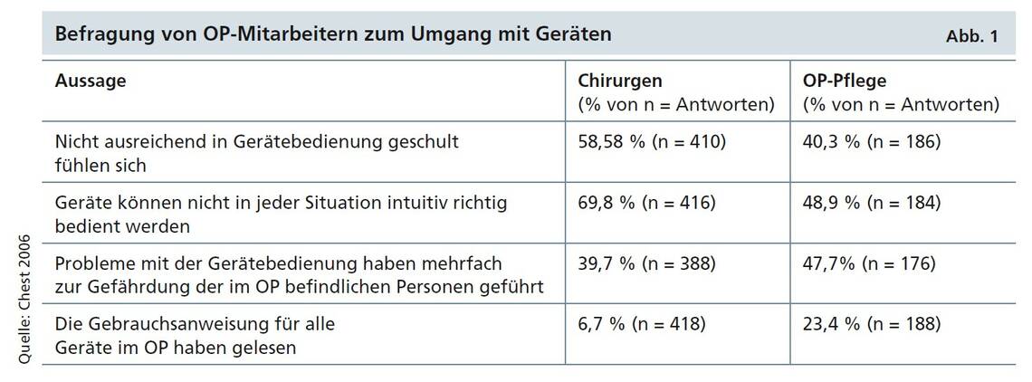 Neben den menschlichen Fehlern (78 %) rangieren technische Fehler an zweiter Stelle. Dabei sind nicht ausreichend geprüfte oder gewartete Ausrüstungen vielfach Ursache für fatale Folgen. Folglich sind Wartungspläne zu beachten. Trotz der Existenz des MPG und der Verpflichtung, danach zu arbeiten, scheinen viele Mitarbeiter in Gesundheitseinrichtungen keine sachgemäße Einweisung zu erhalten oder einzufordern und deshalb intuitiv mit Geräten umzugehen. Eine Befragung von OP-Mitarbeitern zum Umgang mit medizinischen Geräten zeigt deutliche Missstände (Chest 2006, Abb. 1).