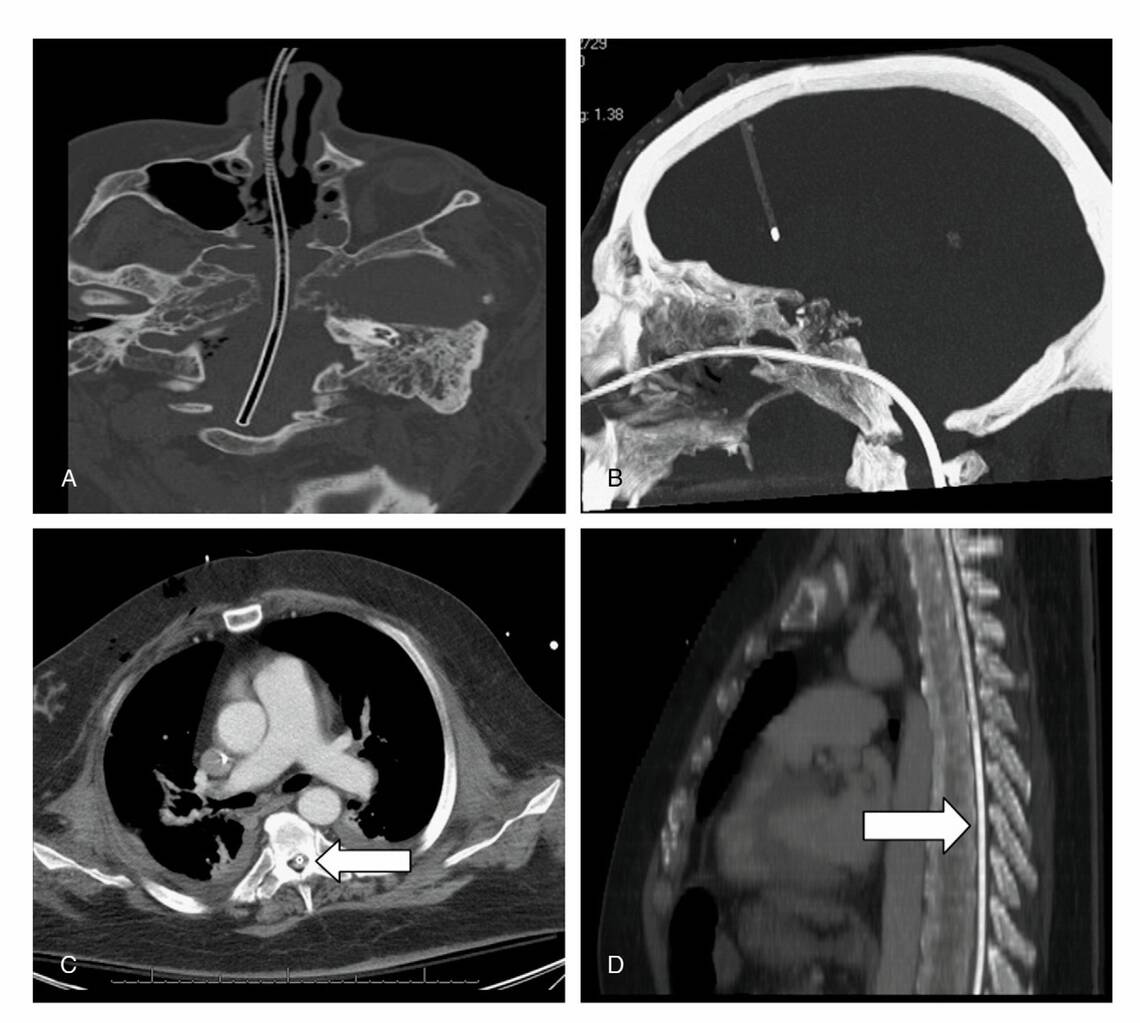 Freij RM, Mullett STH (1997). Inadvertent intracranial insertion of a nasogastric tube in a non-trauma patient. J Accid Emerg Med. 45–47.
