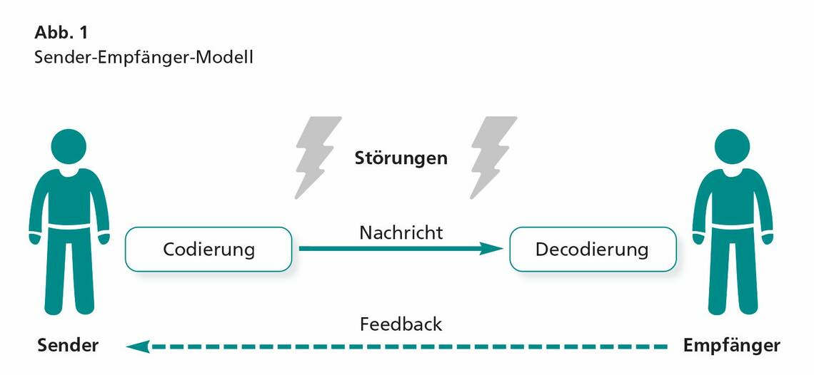 Das sogenannte Kommunikationsmodell nach Shannon und Weaver (Sender-Empfänger-Modell, Abb. 1) beschreibt die Übertragung einer Nachricht zwischen zwei Personen. Dabei wird die Nachricht vom Absender codiert. Als Mittel der Codierung kommen neben der Sprache selbst auch noch zum Beispiel die Tonlage, Gestik, Mimik und Körpersprache zum Einsatz. Die Information wird nun über ein Medium transportiert, zum Beispiel die Luft bei direkter Ansprache, aber auch das Telefon, eine Notiz oder eine E-Mail sind mögliche Medien. Beim Empfänger angekommen, wird die Nachricht von diesem wieder decodiert und verarbeitet. Den gleichen Schritten folgend gibt der Empfänger der Nachricht nun ein Feedback an den Absender.