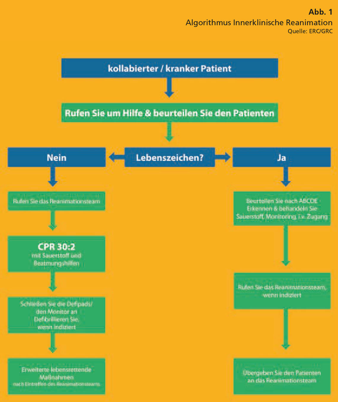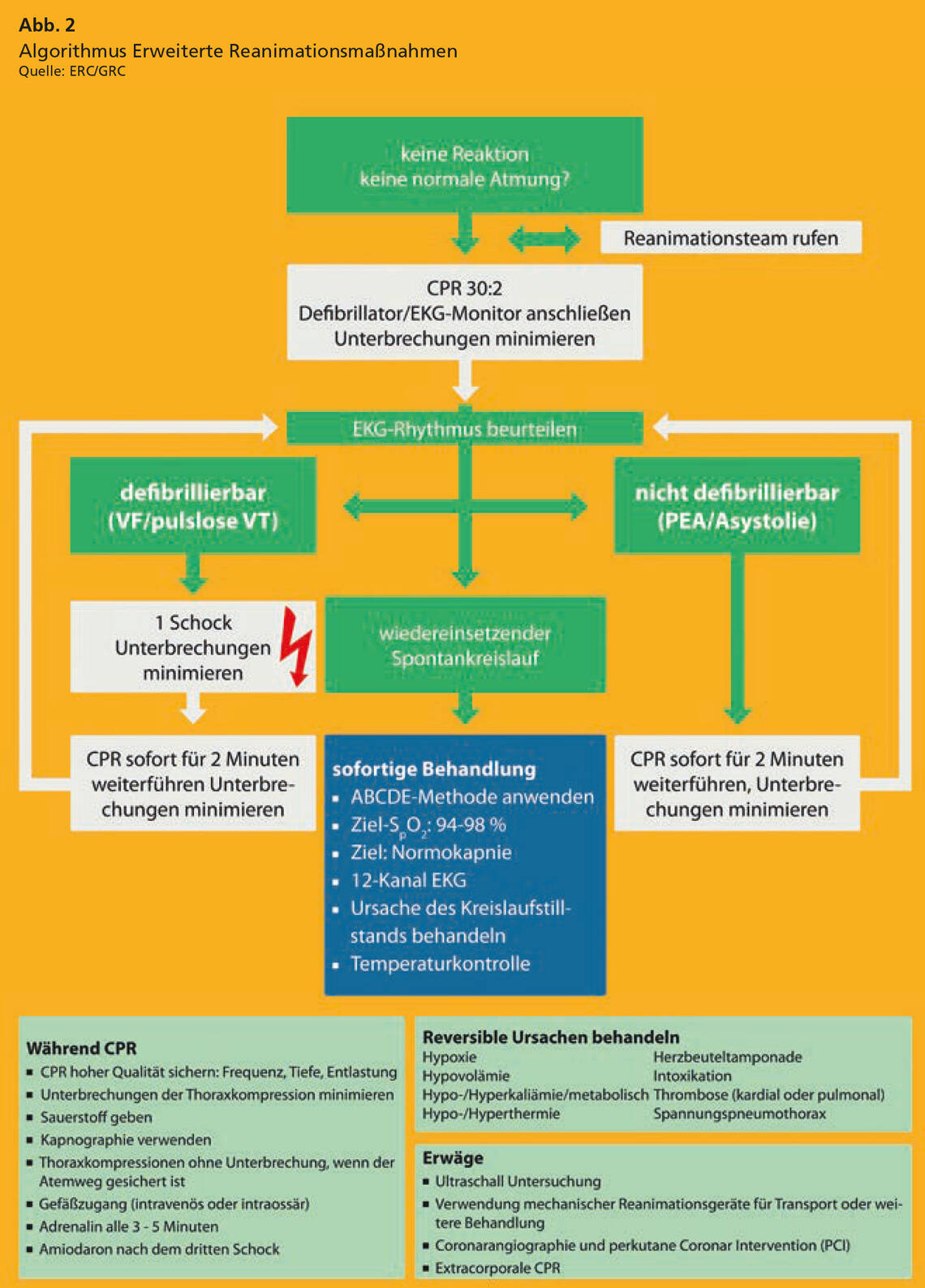 Folgerichtig ist das ABCDE-Schema fester Bestandteil mehrerer Algorithmen des Europäischen Rats für Wiederbelebung (European Resuscitation Council, ERC) und des Deutschen Rats für Wiederbelebung (German Resuscitation Council, GRC). Hierzu zählen beispielsweise die Algorithmen zur Innerklinischen Reanimation (Abb. 1), zu den Erweiterten Reanimationsmaßnahmen (Abb. 2) und zum Vorgehen bei Bradykardie (Abb. 3).