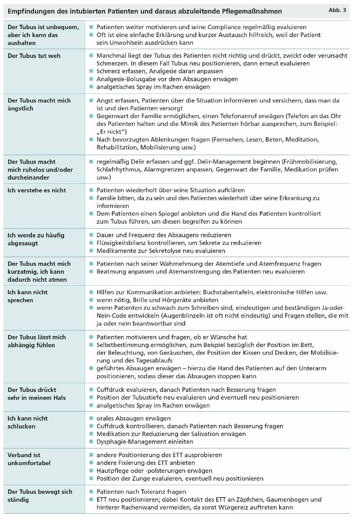 Pflegende können auf die Tubustoleranz positiv einwirken und sie aktiv fördern. Dies setzt zunächst eine professionelle Einschätzung der Tubustoleranz voraus. Hierzu wurde im Jahr 2016 eine Checkliste veröffentlicht (Nydahl et al. 2016), die für Intensivpflegende ein praktikables Instrument darstellt (Abb. 2). Die Autoren haben zudem die häufigsten Empfindungen eines intubierten Patienten und daraus abzuleitende Pflegemaßnahmen zusammengetragen (Abb. 3).