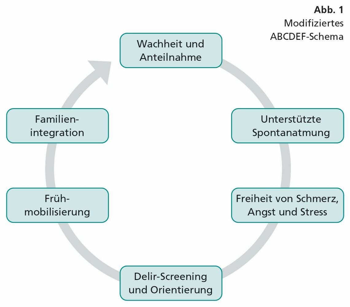Patienten auf Intensivstationen werden heute nach dem ABCDEF-Schema versorgt (Abb. 1). Ziel ist der wache und delirfreie Patient, der von seiner Familie umgeben wird und der keine Schmerzen, Angst und Stress hat. Die Indikation für eine Sedierung – die immer mit einer Immobilisierung des Patienten einhergeht – wird heute nur noch auf wenige Indikationen beschränkt.