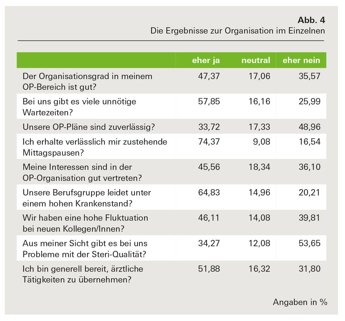 Die Ergebnisse des OP-Barometers 2017 sind im Folgenden in Auszügen dargestellt. Der Fragebogen war unterteilt in die drei Bereiche „Fragen zum Arbeitsplatz“, „Fragen zur Organisation“ und „Fragen zum Patienten“. Jeweils eine Frage wurde zur Berufsentscheidung und zur Verbesserung der Arbeitsplatz-Attraktivität gestellt. Zur Beantwortung der Fragen wurde eine Skala von 1 (sehr) bis 7 (überhaupt nicht) zur Verfügung gestellt. Dabei wurden die Angaben der Skalierung 1 bis 3 zur Aussage „eher ja“, 4 zur Aussage „neutral“ und 5 bis 7 zur Aussage „eher nein“ zusammengefasst.