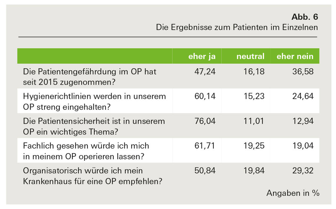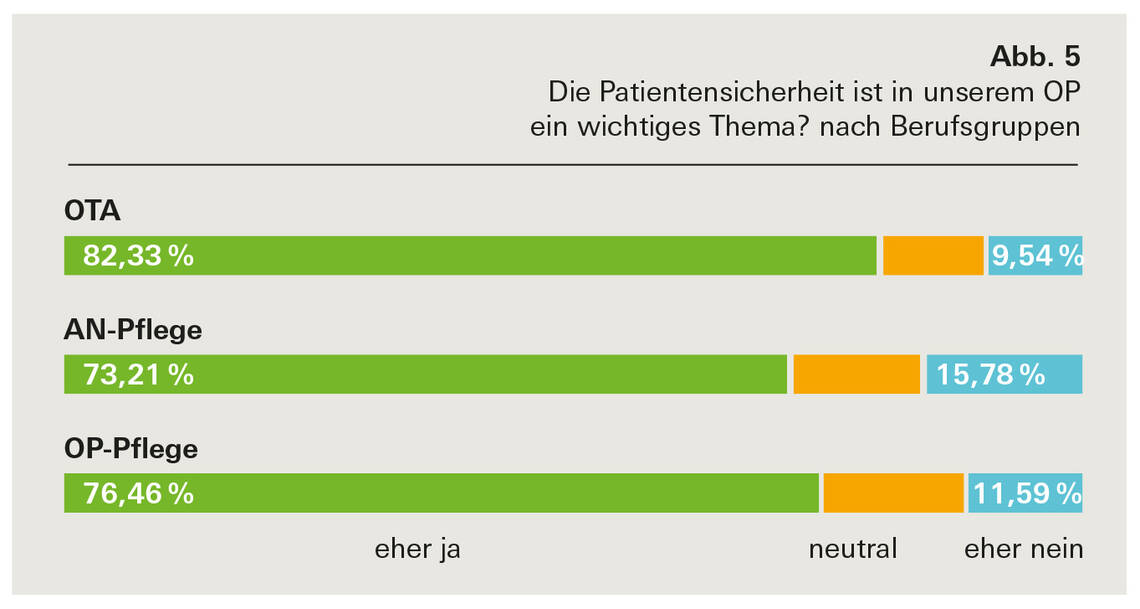Neu in das OP-Barometer aufgenommen wurde die aktuell vieldiskutierte Frage nach der Patientensicherheit. 76,4 Prozent der Befragten beantworteten die Frage, ob die Patientensicherheit in ihrem OP ein wichtiges Thema sei, mit „eher ja“, wobei natürlich auch hier eine Zustimmung von 100 Prozent wünschenswert und erforderlich wäre. Interessant ist die Bewertungsdifferenz zwischen den OTA („eher ja“ 82,3 %) und der Anästhesiepflege („eher ja“ 73,2 %), was sich wahrscheinlich aus einer stärkeren Patientennähe dieser Berufsgruppe erklären lässt.