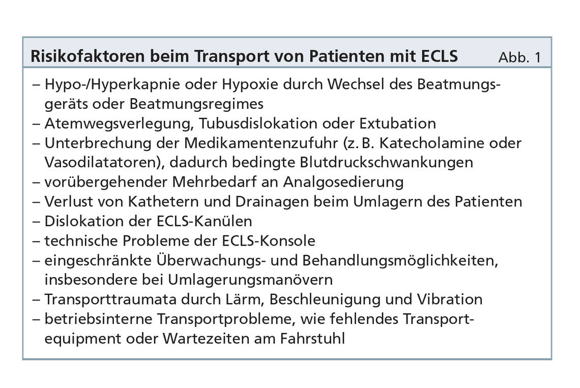 Wenn ein Patient mit Extrakorporalem Life Support System (ECLS) innerhalb einer Klinik transportiert werden soll, ist eine genaue Abwägung des Risikos und Nutzens unumgänglich. Denn der Vorgang ist mit ernstzunehmenden Risiken verbunden. Diese sind zusammenfassend in Abbildung 1 aufgeführt.