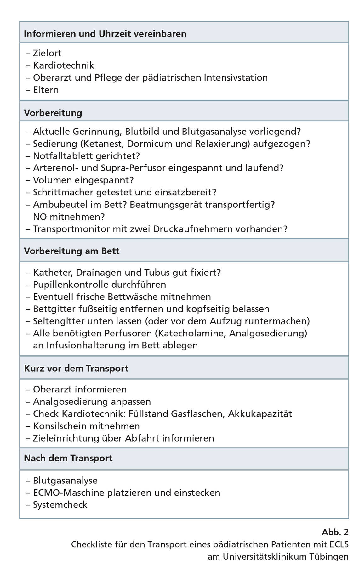 Die Anwendung der Checklisten ist für Mitarbeiter hilfreich, um einen sicheren IHT zu gewährleisten. Abbildung 2 zeigt beispielhaft die Checkliste für einen IHT eines pädiatrischen Patienten mit ECLS.