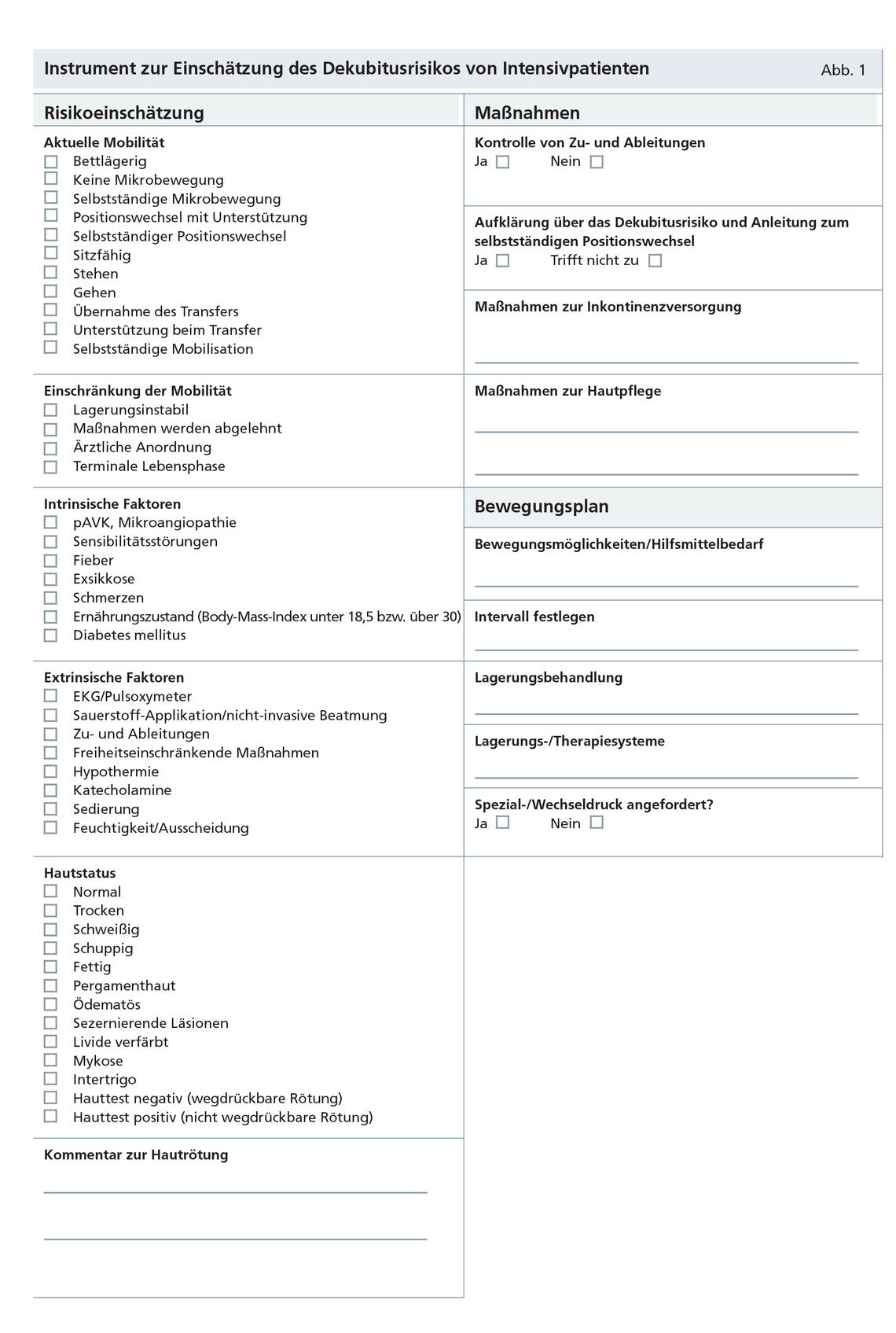Aufgrund der vielfältigen intensivspezifischen Risikofaktoren müssen Intensivpatienten regelhaft mit einem spezifischen Assessment-Instrument eingeschätzt werden. Im Rahmen des Projekts konnte für die Intensivstationen der Kliniken Maria Hilf GmbH ein Instrument zur Einschätzung des Dekubitusrisikos von Intensivpatienten, inklusive einer Maßnahmenplanung zur Dekubitusprophylaxe, entwickelt werden (Abb. 1).