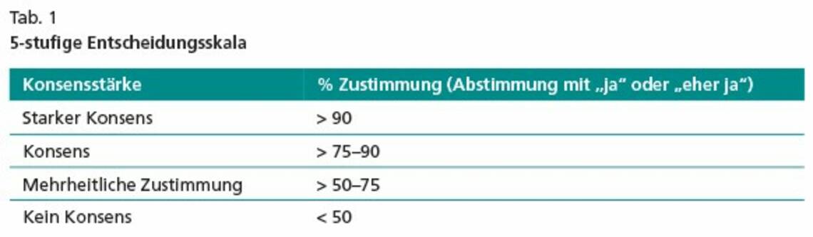Als S2k-Leitlinie wurden die Empfehlungen konsensbasiert getroffen. Dies bedeutet, dass die Autoren der LL im Hinblick auf die Zustimmung zu den jeweiligen Empfehlungen mit einer 5-stufigen Entscheidungsskala (ja, eher ja, unentschieden, eher nein, nein) abgestimmt haben (Tab. 1). Innerhalb der Entscheidungsprozesse wurden von den Autoren jedoch auch die Qualität der ausgewerteten Studien, der erwartbare gesundheitliche Nutzen sowie mögliche Risiken und Nebenwirkungen der Empfehlung berücksichtigt (Elke et al. 2018: 345). Anders als bei S2e- bzw. S3-Leitlinien erfolgt daher in dieser LL keine Angabe von Evidenz- und Empfehlungsgraden, sondern eine prozentuale Darstellung des Autorenkonsens. Insgesamt wurden nach diesem Vorgehen insgesamt 69 Empfehlungen bewertet, die nachfolgend genauer vorgestellt werden.