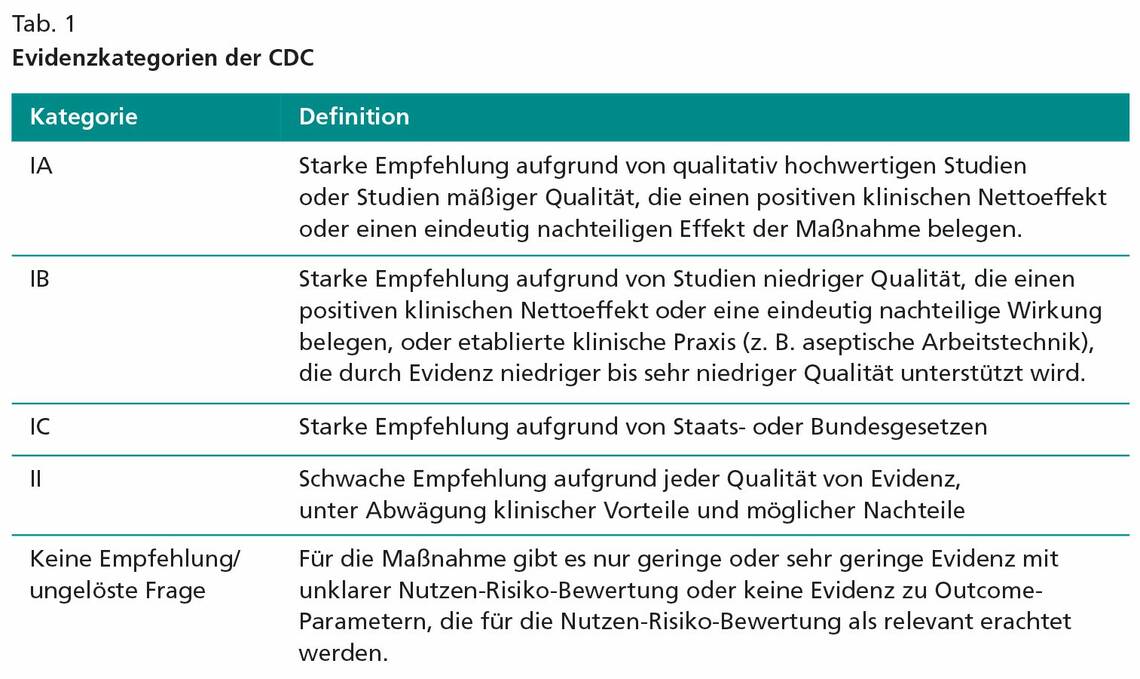 Die US-amerikanischen Centers for Disease Control and Prevention (CDC) aus Atlanta haben kürzlich eine Bestandsaufnahme der neueren Literatur vorgenommen und daraus aktuelle Präventionsempfehlungen abgeleitet (2). Nachfolgend werden die wichtigsten Aussagen der CDC-Leitlinie zusammengefasst. Die von den CDC zugrunde gelegten Empfehlungskategorien sind aus Tab. 1 zu entnehmen.