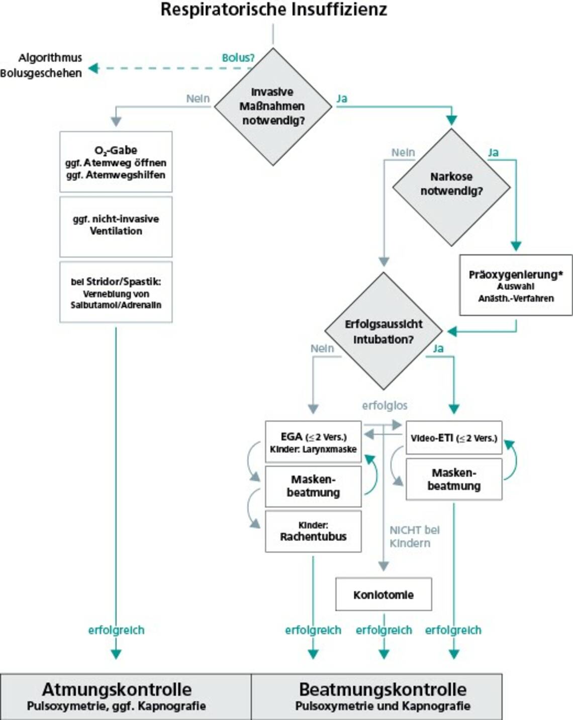 Dieser Abschnitt der LL macht deutlich, dass Vorträge, Simulationstrainings und Phantomübungen nicht ausreichen, um die Fertigkeiten der Atemwegssicherung in Notfallsituationen zu erwerben. Die entsprechende Anzahl von durchgeführten Maßnahmen soll am Patienten unter Anleitung, in Ergänzung zu vorgenannten Ausbildungsmaßnahmen, durchgeführt werden. Die LL macht an dieser Stelle nochmals deutlich, dass zum Erlangen einer grundlegenden Fertigkeit für die endotracheale Intubation deutlich über 50 supervidierte Anwendungen und für extraglottische Atemwege in einer Untersuchung über 40 supervidierte Anwendungen notwendig sind [9]. Weitere Themen der LL sind die Notfallkoniotomie und die Besonderheiten bei Kindern. Um den Rahmen hier nicht zu sprengen, sei auf den Originaltext verwiesen.Algorithmus zum Vorgehen bei respiratorischer Insuffizienz