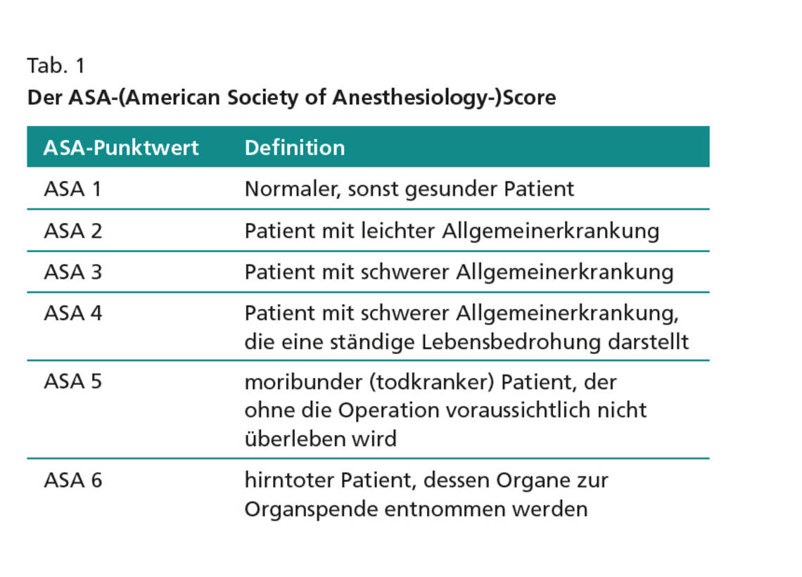 Weitere Faktoren, die in einzelnen Studien eine Korrelation zeigten, waren hohes Alter, Gewichtsverlust vor OP ≥10 %, geringere Beweglichkeit (eigene Angabe der Patienten) sowie ein ASA-Score 2. Der ASA-Score wird präoperativ in fast allen Kliniken ohnehin von der Anästhesie erhoben, um das Narkoserisiko abzuschätzen (Tab. 1). Entsprechende Werte liegen somit meist in der Patientenakte vor.