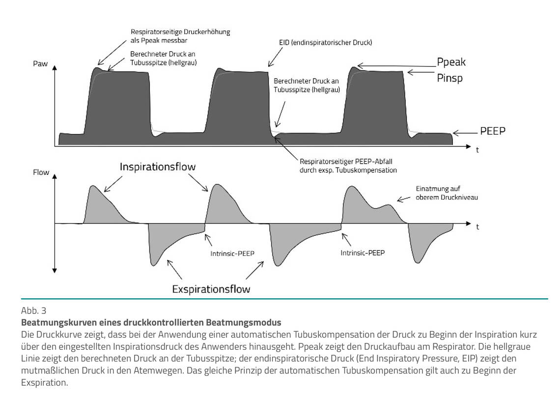 Inspiratorischer Druckanstieg. Der inspiratorische Druckanstieg (Abb. 1, 2) regelt, über welche Zeit der vom Anwender eingestellte Wert des Pressure Support (PS) unter Spontanatemmodi und des Inspirationsdrucks (Pinsp) unter druckregulierter/-kontrollierter Beatmung ansteigt. Meist wird der Druckanstieg in Sekunden oder Millisekunden angegeben. Ein Druckanstieg von z. B. 0,1 Sekunden lässt den Inspirationsdruck nicht sofort ansteigen. Dadurch werden Atemgasverwirbelungen zu Beginn der Inspiration durch einen abrupten Druckwechsel reduziert. Der Atemkomfort für den Patienten kann verbessert werden. Der Atemgasfluss verläuft homogener. Die Standardeinstellung ist 0,05–0,2 Sekunden. Hinweis: Unter nichtinvasiver Beatmung entfällt der Widerstand des Endotrachealtubus. Dadurch wird das Atemgas bei einem zügigen Druckanstieg ungebremst über Beatmungssystem und Maske verabreicht. Der Atemkomfort für den Patienten kann erheblich beeinträchtigt werden. Ein Druckanstieg von 0,1–0,3 Sekunden kann sinnvoll sein. Beim Einsatz eines Beatmungshelms ggf. bis zu 0,4 Sekunden. Bei turbinenbetriebenen Respiratoren für die nichtinvasive Beatmung ist der Druckanstieg stufenweise von z. B. 1–6 einstellbar. Stufe 1 bedeutet i.d.R. einen sehr zügigen Druckanstieg. Welche absolute Zeit sich hinter den jeweiligen Stufen verbirgt, ist nicht immer erkennbar. Exspiratorische Druckabsenkung. Die exspiratorische Druckabsenkung (Abb. 1) regelt, über welche Zeit der vom Anwender eingestellte Wert des Pressure Support (PS) unter Spontanatemmodi und des Inspirationsdrucks (Pinsp) unter druckregulierter bzw. -kontrollierter Beatmung abfällt. Aktuell steht diese Funktion nur bei turbinenbetriebenen Respiratoren für die nichtinvasive Beatmung zur Verfügung. Indem der Inspirationsdruck nicht sofort auf das PEEP-Niveau abfällt, können Atemgasverwirbelungen zu Beginn der Exspiration minimiert werden. Der Atemgasfluss verläuft homogener. Dadurch vermindert sich die Gefahr von Fehltriggerungen zu Beginn der Exspiration. Der Atemkomfort für den Patienten verbessert sich.Beatmungsdrücke