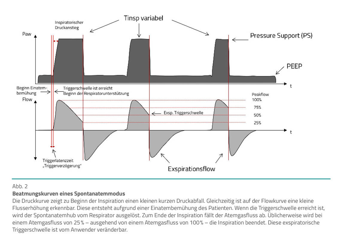 Klassische Spontanatemmodi. Bei klassischen Spontanatemmodi werden Einatembemühungen des Patienten über den eingestellten Trigger erkannt und durch einen Pressure Support (PS) unterstützt. Die Beendigung der Inspiration (Abb. 2) erfolgt durch den einzustellenden Exspirationstrigger. Weist der Patient keine Spontanatmung auf, erfolgt keine Unterstützung durch den Respirator – es sei denn, es ist eine Back-up- bzw. Apnoeventilation eingestellt, die nach einer einzustellenden Apnoezeit aktiviert wird.