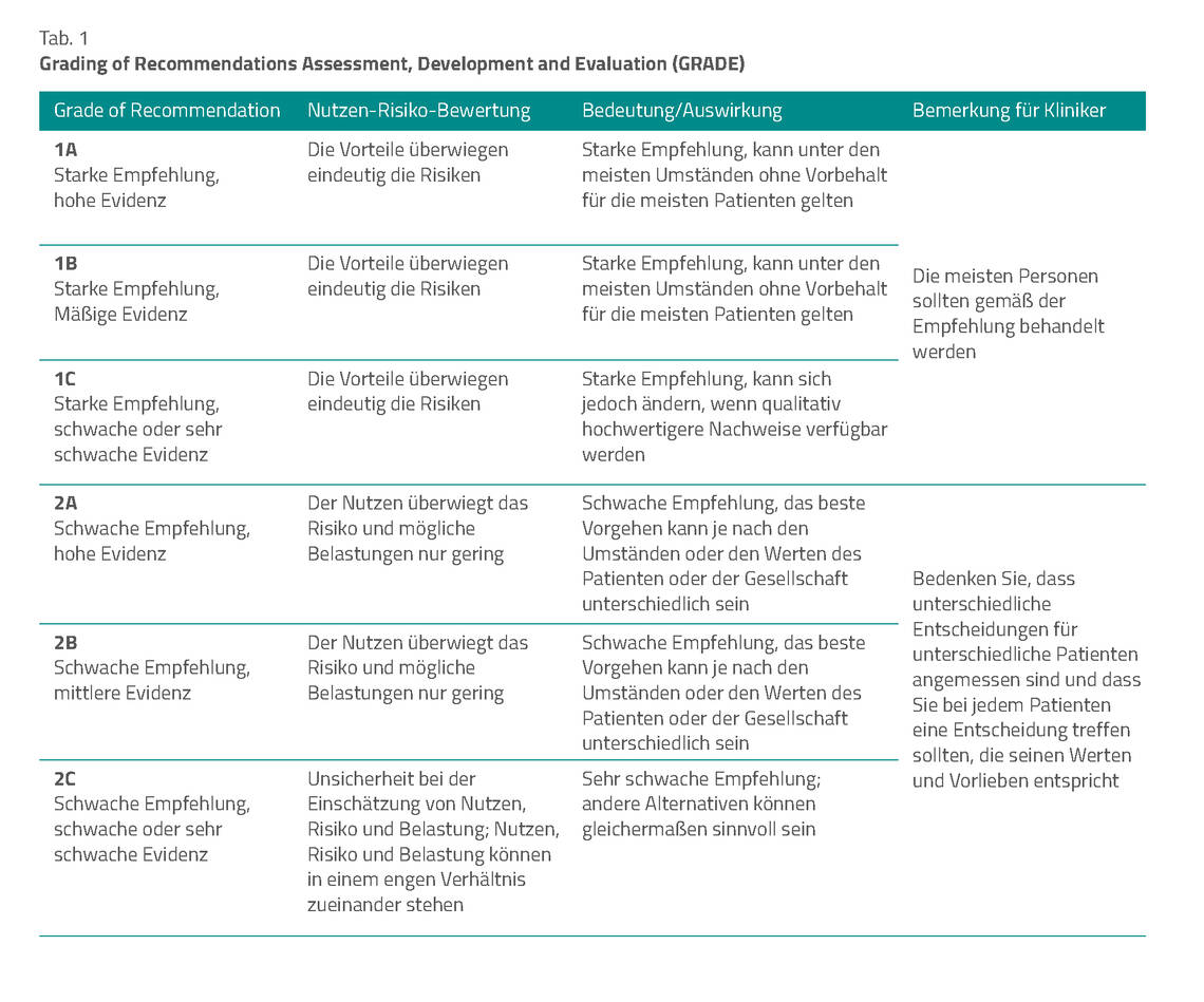 Die Empfehlungen wurden hinsichtlich ihrer Evidenz bewertet und entsprechend eingestuft. Die Einteilung in die Evidenzstufen 1A, 1B, 1C, 2A, 2B und 2C erfolgte nach dem sog. GRADE-System (Grading of Recommendations Assessment, Development and Evaluation, Tab. 1) [2]. Die Empfehlungen der LL sind in verschiedene Abschnitte untergliedert. Dieser Beitrag fokussiert auf einige innerklinisch interessante Empfehlungen oder Schnittstellenbereiche.
