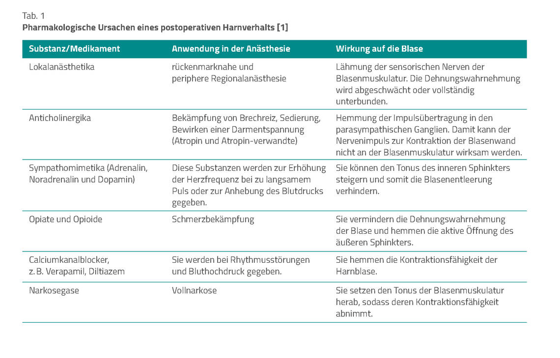 In der Induktionsphase der Opioidtherapie kann es aufgrund einer Druckerhöhung am Blasenauslass häufig zu einem Harnverhalt kommen. Bei Patienten, die solche Analgetika erhalten, ist auf die Miktion besonders zu achten. Tabelle 1 führt eine Auswahl der häufig bei Narkosen und in der postoperativen Phase eingesetzten Pharmaka mit ihren Effekten auf die Harnblasen-Innervation und die Blasenmuskulatur auf.