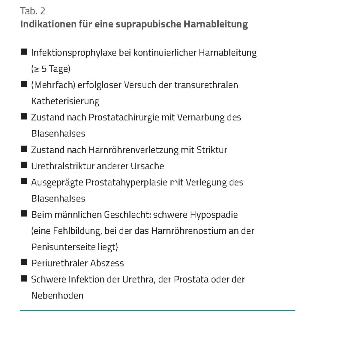 - eine suprapubische Katheterdrainage zur Umgehung und Schonung der Harnröhre bei längerfristig Katheterisierten und nach größeren operativen Eingriffen, insbesondere im kleinen Becken und am Genitale, in Betracht zu ziehen.