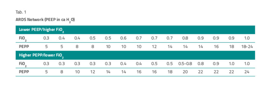 Invasive Beatmung und adjuvante Maßnahmen. Das Atemzugvolumen des ARDS-Patienten soll 6 ml/kg ideales Körpergewicht betragen, der endinspiratorischeAtemwegsdruck ≤ 30 cm H2O. Die PEEP-Einstellung richtet sich nach der ARDS-Network-Tabelle (FiO2-PEEP-Tabelle, Tab. 1), dessen Evidenz allerdings in der S3-Leitlinie zur invasiven Beatmung als schwach bezeichnet wird. Bei moderatem und schwerem ARDS werden höhere PEEP-Werte empfohlen, die sich an der Higher-PEEP-Tabelle des ARDS-Networks orientieren sollen.