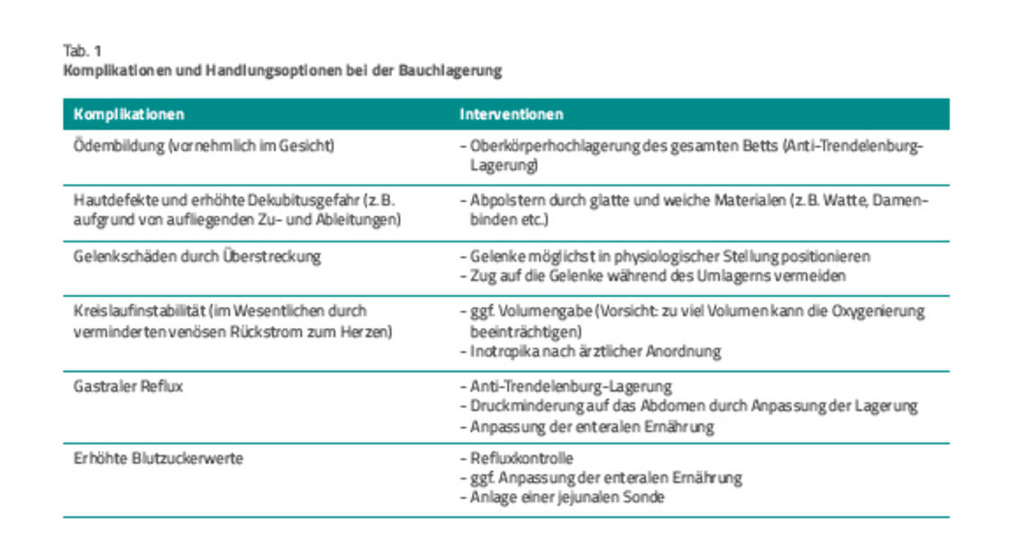 Komplikationen. Die Bauchlagerung ist eine mit deutlichen Risiken einhergehende Intervention. Tabelle 1 bietet einen Überblick möglicher Komplikationen und zeigt entsprechende Handlungsoptionen auf.
