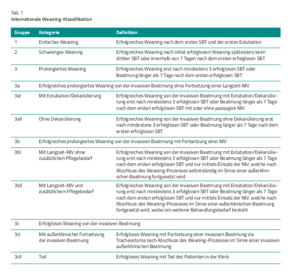 Um der Komplexität der Patientengruppen besser gerecht zu werden, haben die Autoren in der aktualisierten LL die internationalen Weaning-Klassifikationen ergänzt (Tab. 1). Die Empfehlungen der LL gelten in erster Linie für Patienten der Weaning-Kategorie 3 mit den entsprechenden Untergruppen 3a bis 3c.