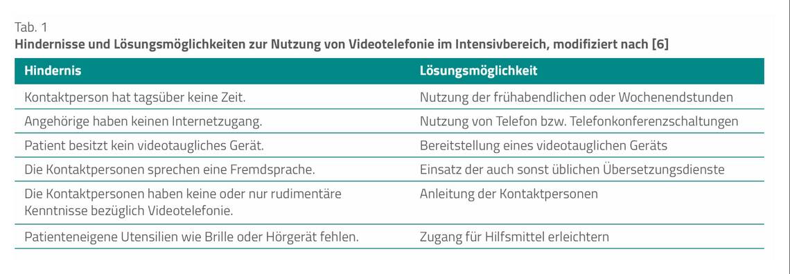 Eine der am häufigsten genutzten Lösung ist die der sogenannte Videotelefonie, die den Kontakt von Patienten und Bezugspersonen risikofrei ermöglicht [4]. Für den Einsatz der Videotelefonie auf der Intensivstation sind jedoch einige Hindernisse zu überwinden. Die häufigsten Probleme und entsprechende Lösungsansätze sind in Tabelle 1 zusammengefasst.