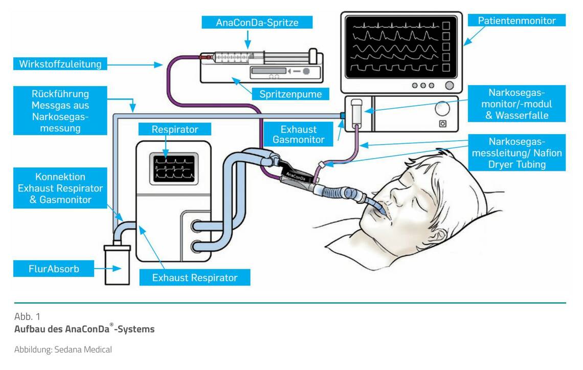 Aufbau des Systems. Die Funktionsweise der inhalativen Sedierung am Beispiel des am häufigsten eingesetzten Systems AnaConDa® zeigt Abbildung 1.