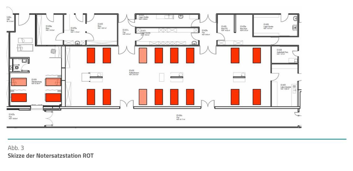 Parallel zum Aufbau der Kommunikationsstrukturen werden die Notersatzstationen (NES) ROT, GELB und GRÜN sowie ein Sichtungsbereich eingerichtet (Abb. 2).