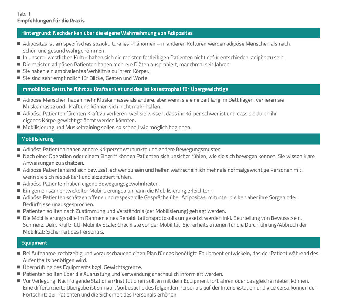 [6] Klarmann S, Klocke J. Mobilisation des adipösen Patienten – Steigende Anforderungen an Personal und Ausstattung. Medizinische Klinik – Intensivmedizin und Notfallmedizin 2017, 112 (1), 53–58