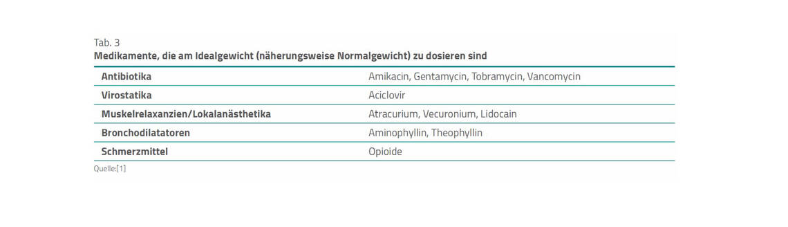 Medikamente mit geringem Verteilungsvolumen und geringer therapeutischer Breite sollen bei deutlicher Adipositas am Normalgewicht dosiert werden. Die vorgenannten Medikamente sollen bei ausgeprägter kindlicher Adipositas nach dem Idealgewicht dosiert werden und nicht nach dem „gewogenen Gewicht“. Dies gilt generell für Sedativa und Analgetika, da eine Dosierung nach dem gewogenen Gewicht bei adipösen Kindern eine Überdosierung verursachen kann. Kinder, die diesbezüglich gemäß Leitlinie ein stark erhöhtes Risiko aufweisen, sind in Tabelle 2 aufgeführt. Weitere Medikamente, die anhand des Idealgewichts dosiert werden sollen, zeigt Tabelle 3 [1].