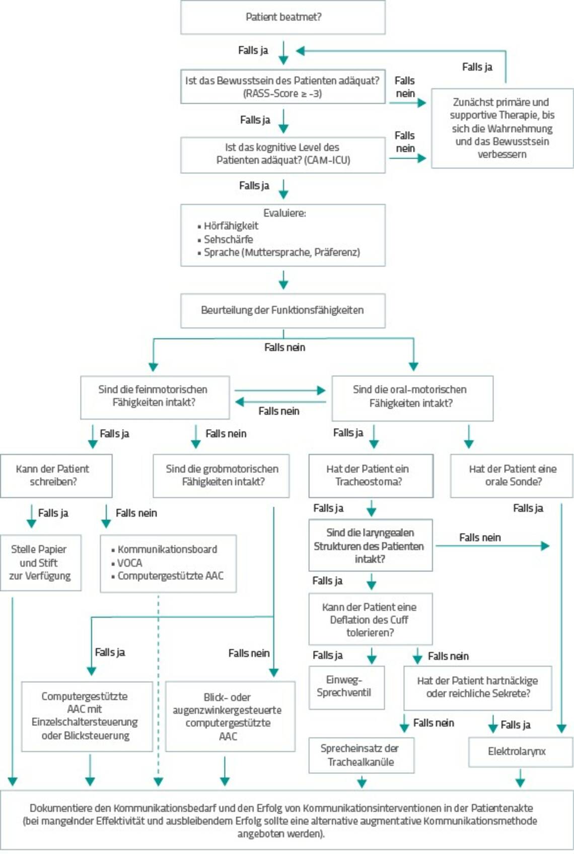 Zur Verbesserung der Kommunikation empfiehlt die Leitlinie die Verwendung eines Kommunikationsalgorithmus, um den Ansatz der Auswahl verschiedener augmentativer und alternativer Kommunikationsmethoden (AAC) zu standardisieren (Abb. 1).