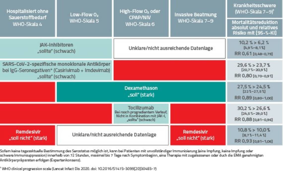 - SARS-CoV-2-spezifische monoklonale Antikörper: In der frühen Phase einer SARS-CoV-2-Infektion, in der die Patienten noch keine humorale Immunantwort entwickelt haben, können SARS-CoV-2 spezifische monoklonale Antikörper wie Casirivimab und Imdevimab die 28-Tage-Sterblichkeit reduzieren und haben einen positiven Einfluss auf die Wahrscheinlichkeit einer Krankheitsprogression mit Notwendigkeit einer invasiven Beatmung oder Tod bis zum Tag 28. Insbesondere bei IgG- seronegativen Patienten mit COVID-19 sollte eine Therapie mit der Kombination beider Medikamente erfolgen. Da die tagesaktuelle Bestimmung des Serostatus sich in der Praxis als schwierig erweist, gilt diese Empfehlung auch bei Patienten mit un-klarem Serostatus. Diese Empfehlung beruht allerdings auf Expertenmeinungen unter Einbeziehung der verfügbaren Evidenz zur Wirksamkeit und Verträglichkeit von SARS-CoV-2-spezifischen monoklonalen Antikörpern und auf Erfahrungen aus individuellen Heilversuchen.