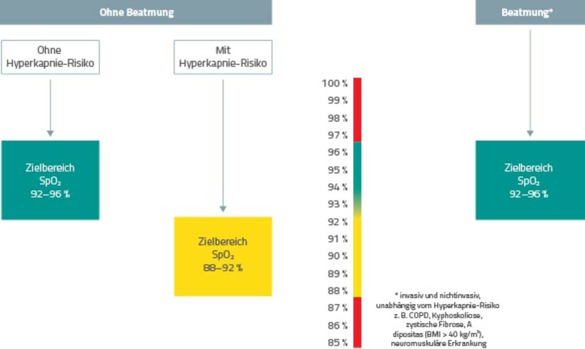 - In der Gruppe ohne Beatmung und ohne Hyperkapnie-Risiko wird eine Sättigung von 92 % bis 96 % angestrebt (Empfehlungsgrad: A).