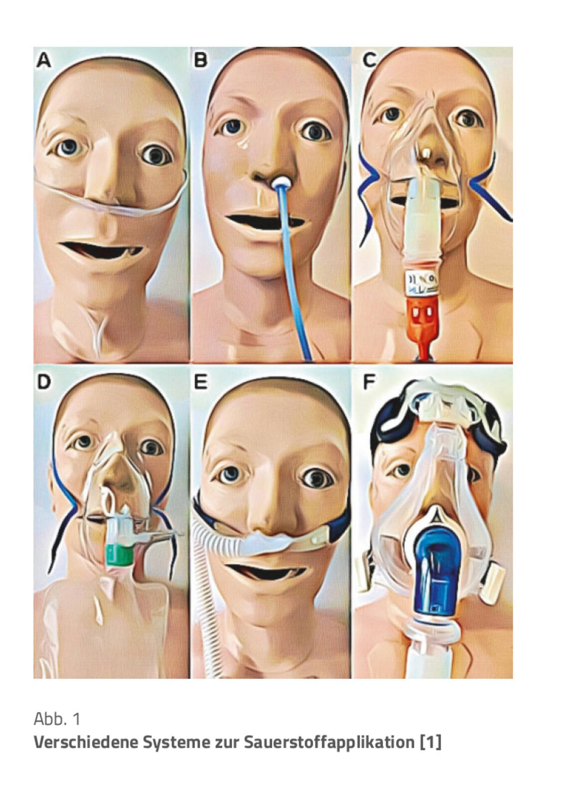 Sauerstoffapplikationssysteme. Die Möglichkeiten, Sauerstoff zu verabreichen, sind vielfältig. Sie umfassen Nasenbrillen (A in Abb. 1), Nasensonden (B), einfache Gesichtsmasken, Venturi-Masken (C), Reservoirmasken (D), High-Flow-Kanülen = HFNC (E) und Masken für non-invasive Ventilation, NIV-Masken (F).