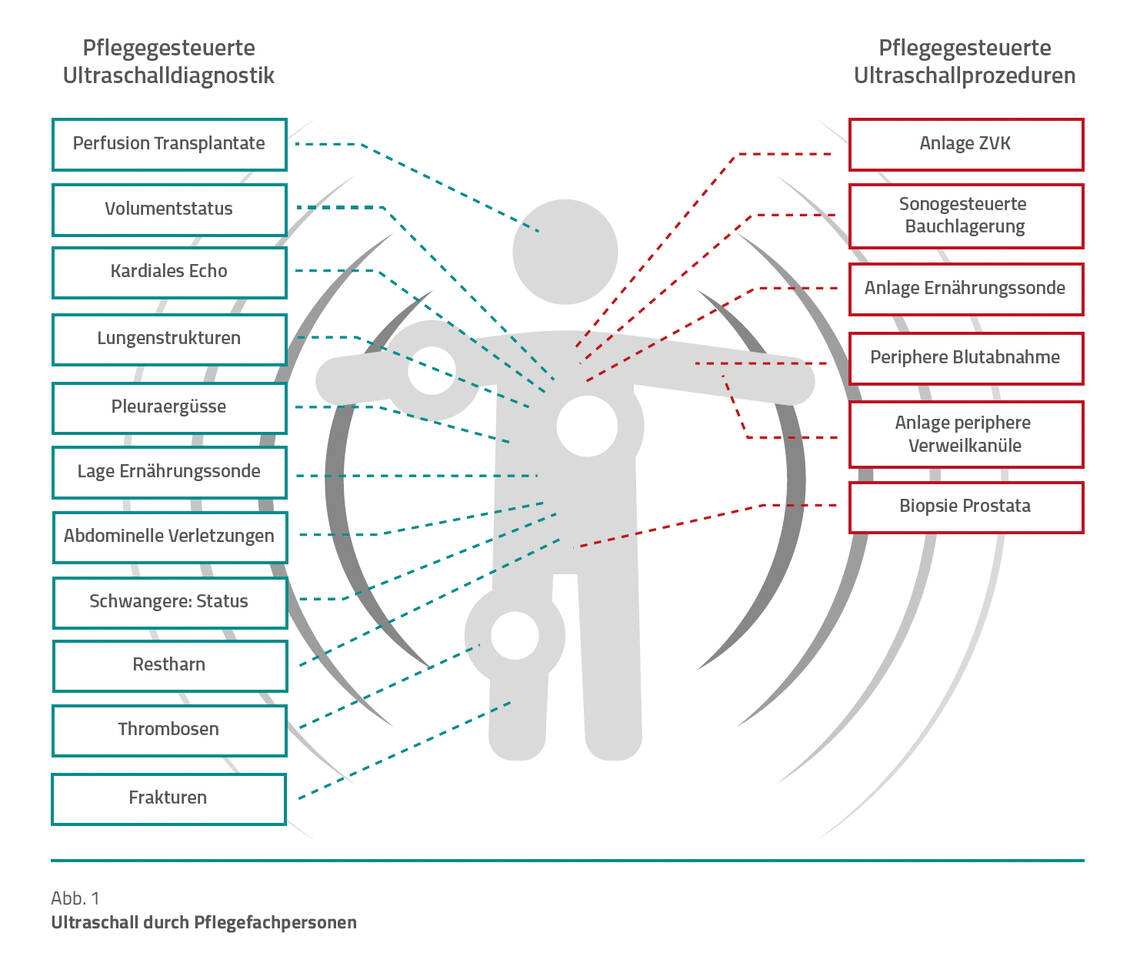 Pflegefachpersonen nutzen Sonografie zur Bestimmung des Volumenstatus an der Vena Cava [4], zur Bestimmung fraglicher Pleuraergüsse [4], der Lungenstrukturen [3], des Restharns [1], der Darmmotilität [10], des gastralen Restvolumens [10], von Knochenbrüchen [8], thorakaler und abdomineller Traumen [8], von Thrombosen [10], arteriovenösen Fisteln [10], innerer Blutungen [8], von Weichteilverletzungen [8] und zum Auffinden von Fremdkörpern aus Holz, Plastik oder Metall [8].