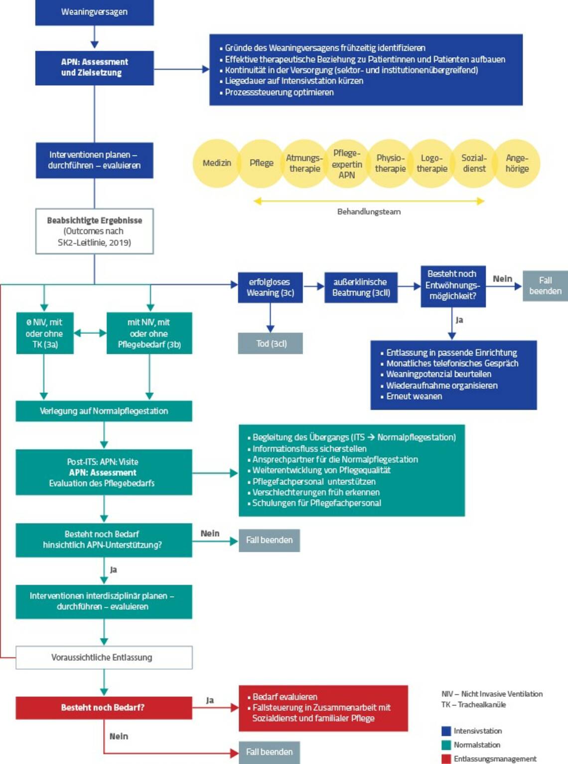 War das Weaning erfolglos und ist eine Entlassung in eine Beatmungseinrichtung geplant, stellt die APN wieder den Informationsfluss zwischen dem Krankenhaus und der Einrichtung sicher und ist auch dafür verantwortlich, die Bereitschaft zum Weanen erneut zu bewerten. Die Reevaluation der Entwöhnungsbereitschaft wird telefonisch abgefragt. In Fällen, in denen das Weaning erneut versucht wird, kommt es zur Wiederaufnahme auf die ITS.