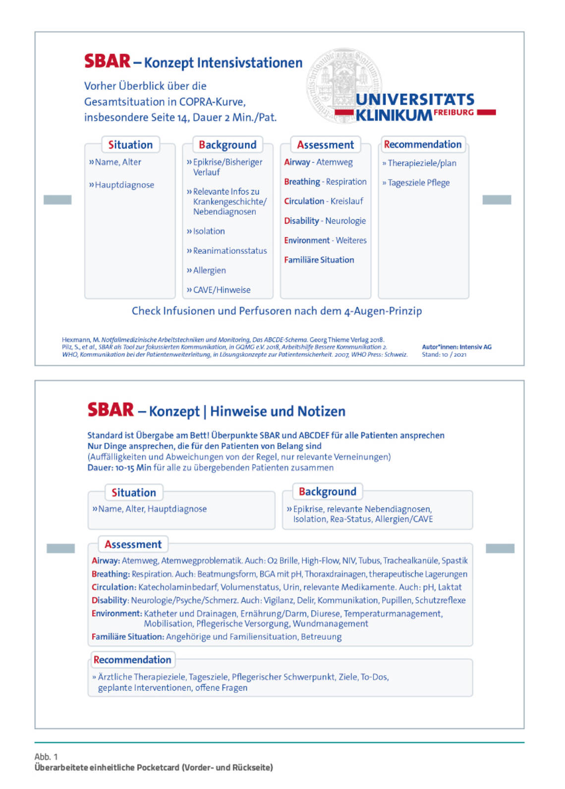 Anschließend wird eine mündliche Übergabe am Patientenbett nach der SBAR-Struktur durchgeführt. Diese wurde auf der Basis der neu gewonnenen Informationen aufgebaut. So wurde die Pocketcard überarbeitet und zusätzlich die Struktur des ABCDE-Schemas (Airway, Breathing, Circulation, Disability, Environment bzw. Exposure) als ein bekanntes Instrument zur strukturierten Kommunikation in Notfallsituationen [5] im Bereich „Assessment“ hinterlegt (Abb. 1). Um das soziale Umfeld mit aufzunehmen, wurde nach dem „E“ noch das „F“ für Familie hinzugefügt. Die Vorderseite der Pocketcard bildet die Übergabestruktur ab, die Rückseite dient als Gedächtnisstütze.