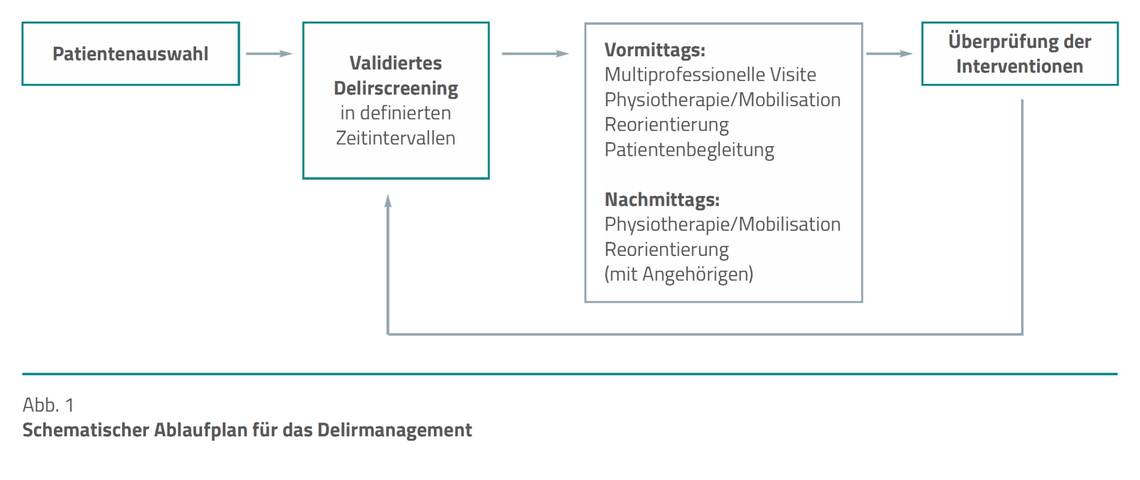 Interventionen. Die Interventionen im Tagesverlauf richten sich individuell nach dem Zustand und der Situation der Patienten und werden gemeinsam im interdisziplinären Team diskutiert. Wichtige Eckpunkte in der Therapie sind Mobilisation, Reorientierung, Vermeidung von Polypharmazie sowie die Patientenbegleitung [6].