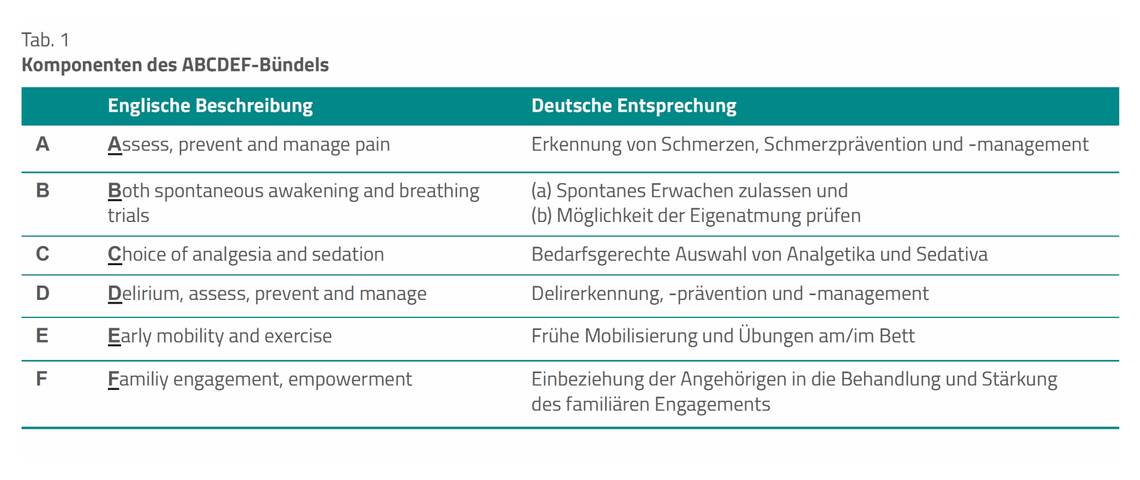 Der medizinische Fortschritt hat sich in den vergangenen Jahren weiter verbessert; mehr Intensivpatienten überleben. Vor diesem Hintergrund hat das PICS an Bedeutung zugenommen. Auch im Rahmen der neuen, überarbeiteten Sepsis-Leitlinie erfährt das Thema Berücksichtigung. Es besteht zunehmend Einigkeit darüber, der Entwicklung eines PICS präventiv entgegenzuwirken. Die wichtigsten Maßnahmen lassen sich in einem Bündel unter dem Akronym ABCDEF zusammenfassen (Tab. 1). Eine der größten aktuellen Studien aus den USA hat die Qualitätsinitiative mit der Umsetzung des ABCDEF-Bündels zur Verbesserung des klinischen Behandlungsergebnisses untersucht [1].