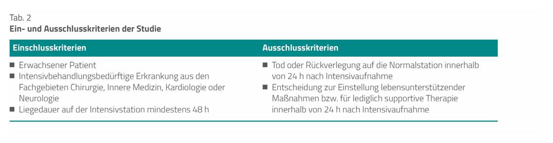 Das Protokoll sah vor, dass die teilnehmenden Studienzentren zunächst retrospektiv über sechs Monate die Behandlungsergebnisse ihrer Patienten vor Beginn der Qualitätsinitiative erfassen und dokumentieren sollten. Für diesen „Vorzeitraum“ war die Zeitperiode Januar bis Juni 2015 vorgesehen. Eine sechsmonatige Phase danach diente der Einübung der Erfassungsmethode, mehreren Teamtreffen, der Diskussion der erfassten Daten sowie einer konkreten Besprechung bestimmter Vorgehensweisen bei der Analgesie/Sedierung, der frühen Mobilisierung und anderer Bündelmaßnahmen. Anschließend waren prospektiv über 14 Monate die Maßnahmen des ABCDEF-Bündels auf den teilnehmenden Stationen zu implementieren und parallel dazu prospektiv die klinischen Verlaufsdaten zu erfassen. Dieser Zeitraum war von Januar 2016 bis März 2017 geplant. Die vorgegebenen Ein- und Ausschlusskriterien für die Patienten der Studie ergeben sich aus Tabelle 2.