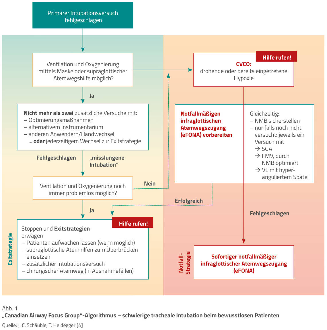 Sind Ventilation und Oxygenierung des Patienten entweder nach dem ersten oder den dann anschließenden Versuchen zur Sicherung der Atemwege nicht sicherzustellen, so handelt es sich hierbei um einen Notfall (CVCO-Situation), der mit Verfolgung einer entsprechend festgelegten Notfallstrategie (Abb. 1) zu behandeln ist. Die „cannot ventilate – cannot oxygenate“-Situation definiert sich als bereits eingetretene oder drohende Hypoxie mit einer SpO₂ < 90 % aufgrund mehrfach gescheiterter Ventilations- oder misslungener Intubationsversuche. Weitere Hilfe ist in diesem Fall unmittelbar anzufordern.