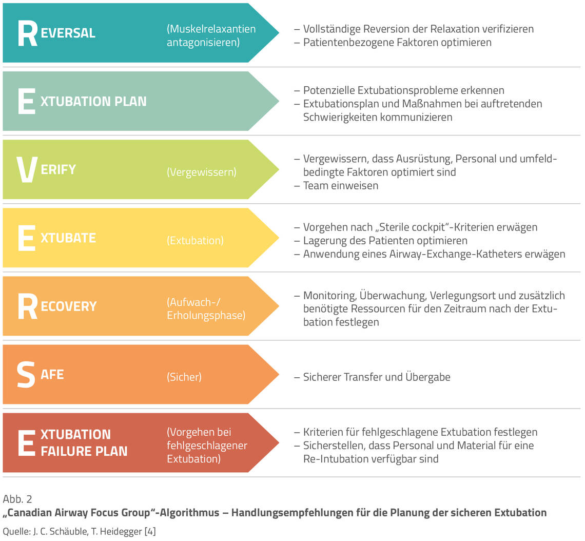 Neben der Berücksichtigung der Empfehlungen für eine voraussichtlich erschwerte Extubation (Abb. 2) sollte überprüft werden, ob eine Extubation grundsätzlich zu tolerieren ist beziehungsweise bei einer erforderlichen Re-Intubation mit erneuten Problemen einhergehen könnte. Als Hilfsmittel ist auch die endotracheale Platzierung eines speziellen Airway-Exchange-Katheters in Erwägung zu ziehen, der bei entsprechender Toleranz des Patienten sowohl als Führungshilfe für eine optionale Re-Intubation als auch zur Sauerstoffapplikation dienen kann [8].