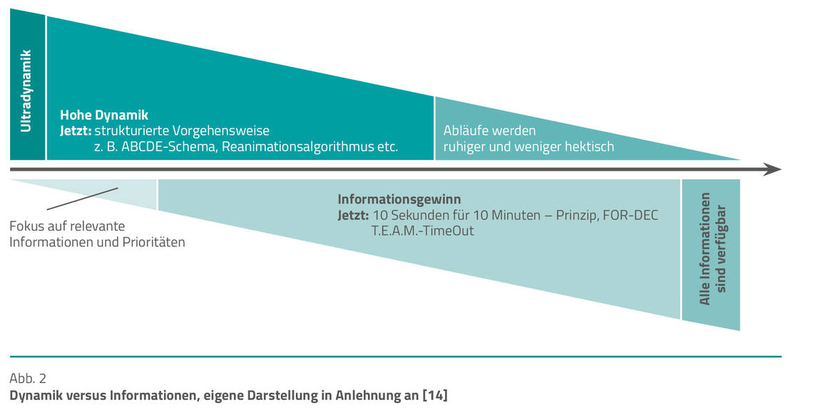 Im Notfall ist anfänglich noch eine hohe Eigendynamik vorhanden und die Menge an Informationen, zum Beispiel zum Patientenhintergrund oder zum Ereignis, das die Zustandsverschlechterung womöglich ausgelöst hat, gering. Mit der Zeit nimmt diese Dynamik ab und der Informationsgehalt wächst stetig (Abb. 2). Vor allem aber birgt die (Ultra-)Dynamik zu Beginn, neben den bereits beschriebenen Auswirkungen auf die kognitiven Ressourcen der Teammitglieder, das Risiko für Impulshandlungen in sich, die weniger auf Grundlage eines Abwägungsprozesses oder konkreter Informationen beruhen.