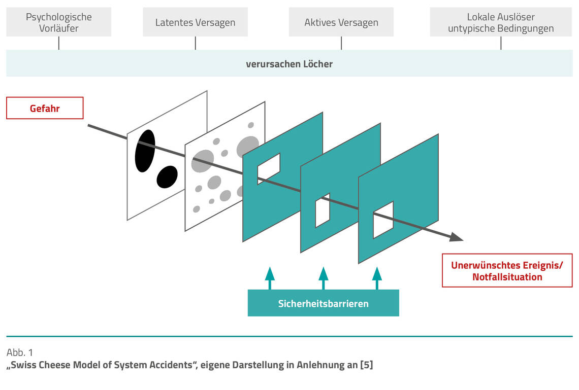 Diese Art der Systemanpassung oder der Sicherheitsarchitektur ist charakteristisch für Hochsicherheitsorganisationen und -bereiche wie Einrichtungen des Gesundheitswesens [4]. Das in diesem Zusammenhang häufig genutzte „Swiss Cheese Model of System Accidents“ [5] (Abb. 1) veranschaulicht die Verkettung verschiedener Einzelschritte zu einem unerwünschten Ereignis. In Anlehnung an dieses Modell bedarf es, zur Schaffung des Fehlerverständnisses, einer Differenzierung zwischen aktivem und latentem Versagen.