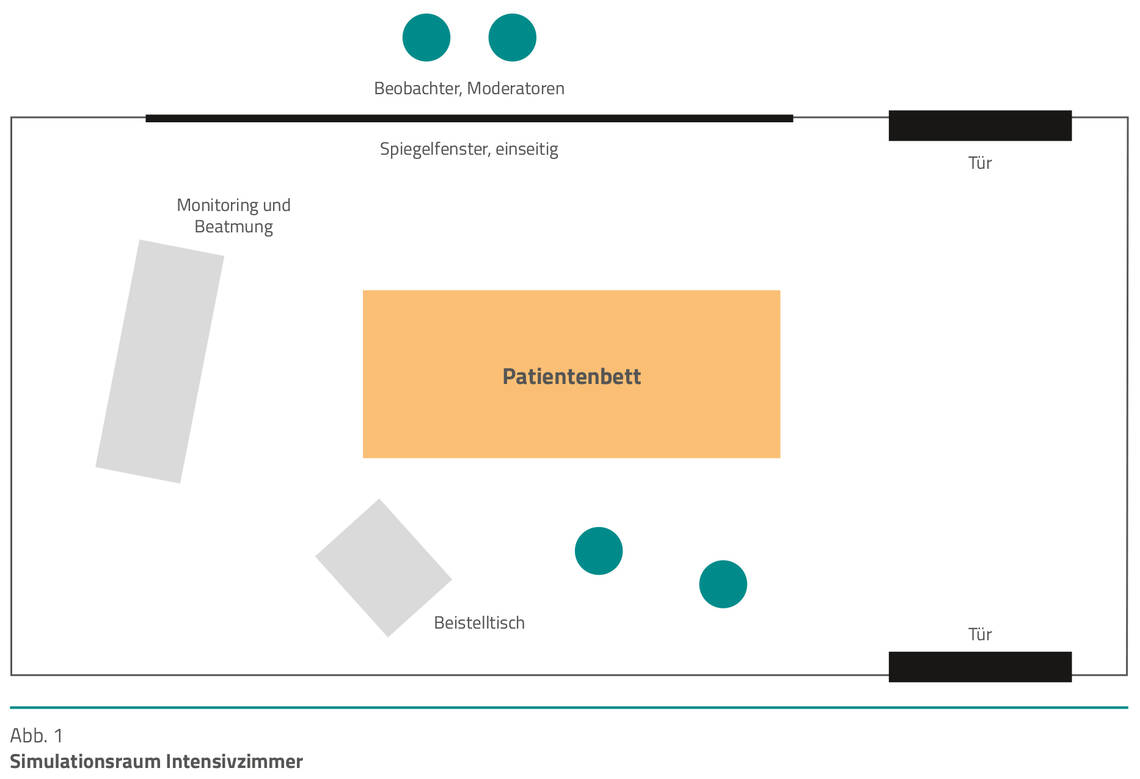 Zudem hat das Trainingszentrum des UKM, das sich in örtlicher Nähe zum Studienhospital befindet, bereits vertiefende Erfahrungen im Bereich der Trainings interprofessioneller Gruppen in herausfordernden Situationen (zum Beispiel Notfalltrainings) und bietet neben einem kompetenten Team mit seiner modernen Technik (Simulationsraum Intensiv mit komplettem Überwachungsmonitoring, Abb. 1) optimale Bedingungen für eine realitätsnahe Schulung.