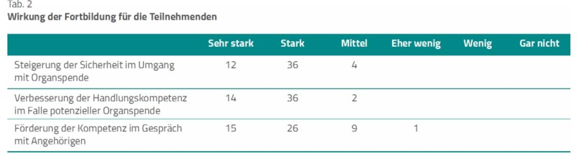 Ebenso haben sie durchweg eine Steigerung ihrer Sicherheit im Umgang mit der Organspende erfahren (48 von 52). Die Verbesserung der Handlungskompetenz ist deutlich gestiegen (50 von 52), auch beschreiben die Teilnehmenden eine höhere Kompetenz in Angehörigengesprächen (41 von 51) – eine Person machte dazu keine näheren Angaben (Tab. 2).