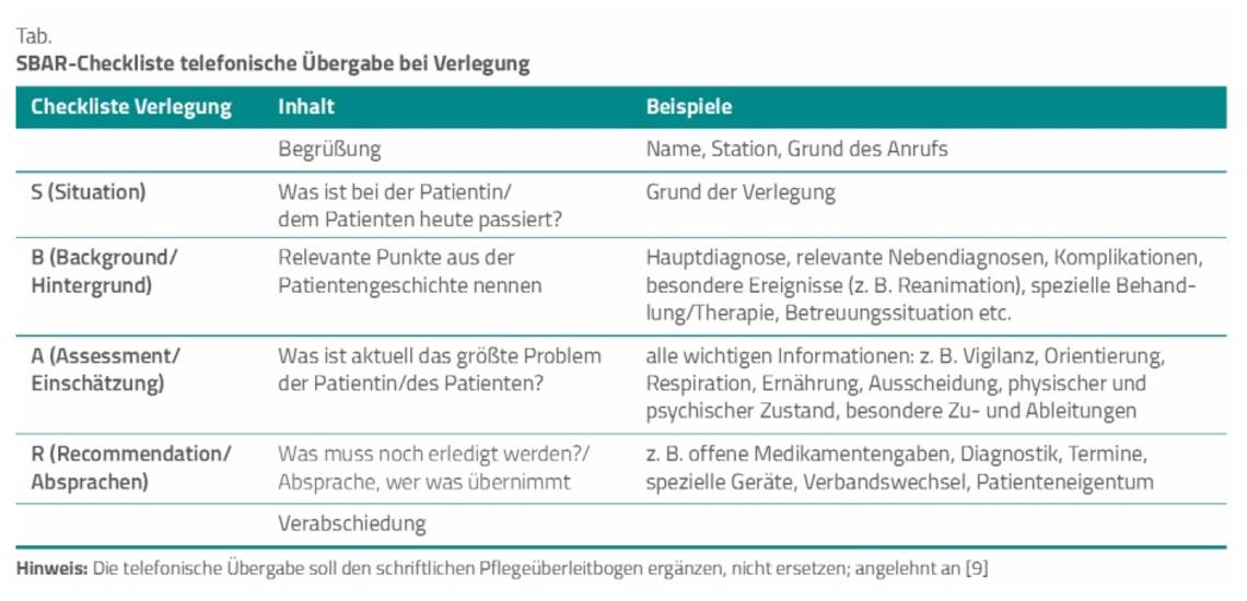 Deshalb gilt es als sinnvoll, eine strukturierte Übergabe unter Zuhilfenahme von Checklisten, Übergabeprotokollen oder Prozessabläufen zu implementieren, um die Kommunikation zu verbessern. Ein dazu geeignetes Tool ist die SBAR-(Situation, Background, Assessment, Recommendation-)Checkliste (Tab.) [7].